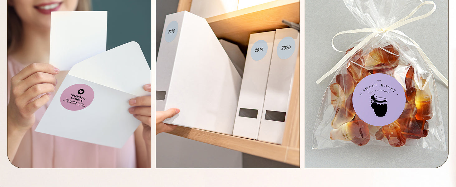 Vielseitig verwendbar: Munbyn-Etiketten eignen sich für individuelle Logoetiketten, Produktetiketten, handgefertigte Waren, Bäckereiaufkleber, Hochzeitsaufkleber, Verschlussaufkleber für Postumschläge und mehr zur Identifizierung von Gegenständen und schnellen Organisation. Sie können nicht nur zu Hause, sondern auch weit verbreitet in Büros, Schulen, Supermärkten, Einzelhandelsgeschäften, Juweliergeschäften usw. verwendet werden.